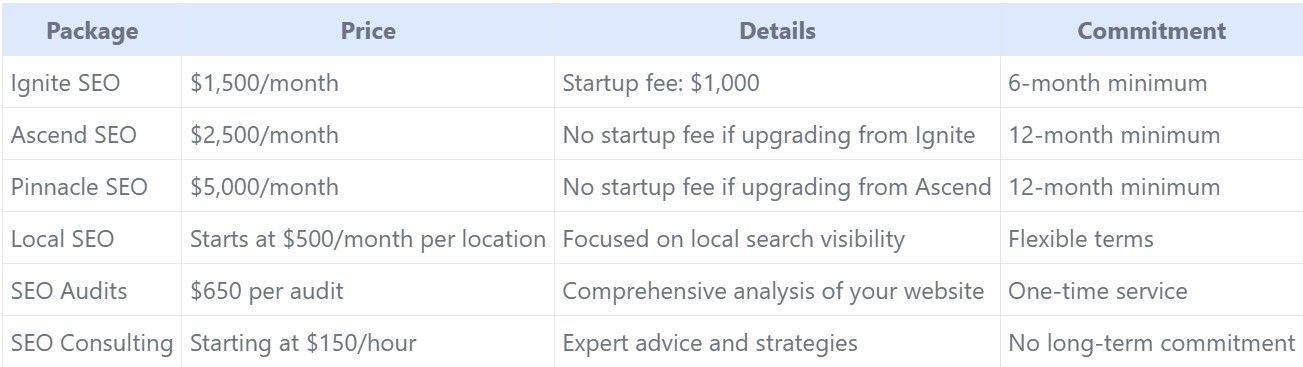 For example, key service types like local SEO can start as low as $500 per location and audits at $650 each. Packages such as Ignite SEO come in at $1,500 per month and include essentials like site audits, on-page improvements, and optimized blog content.